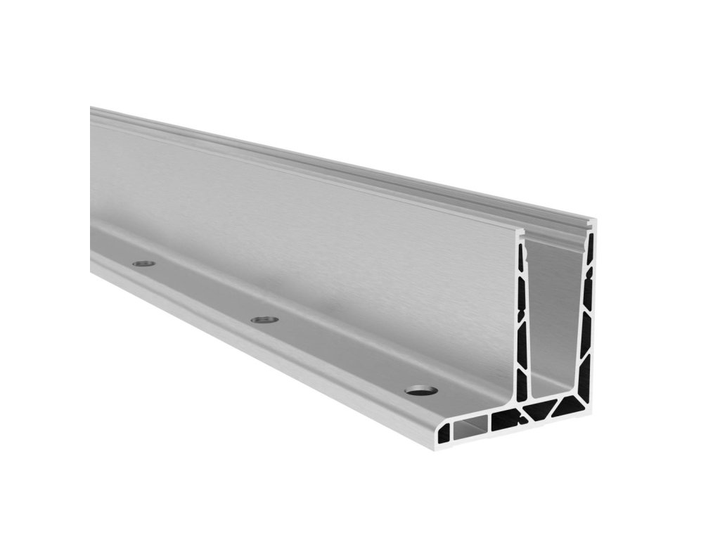 Al. kotviaci profil pre sklo T=12 až 17,52mm, kotvenie z vrchu do podlahy, nastaviteľný sklon skla. Dodávané v dĺžke L5000mm (25ks otvorov d14mm pre kotvenie). Dodávané bez tesnení.Povrchová úprava ELOX - brus.Materiál: Hliník, Povrchová úprava: Satin-ELOX, Glass t: 12-17,52, L: 5000, Efekt: ELOX, Kotvenie: Zhora, G/h kN: 1, Dĺžka: 5 m
