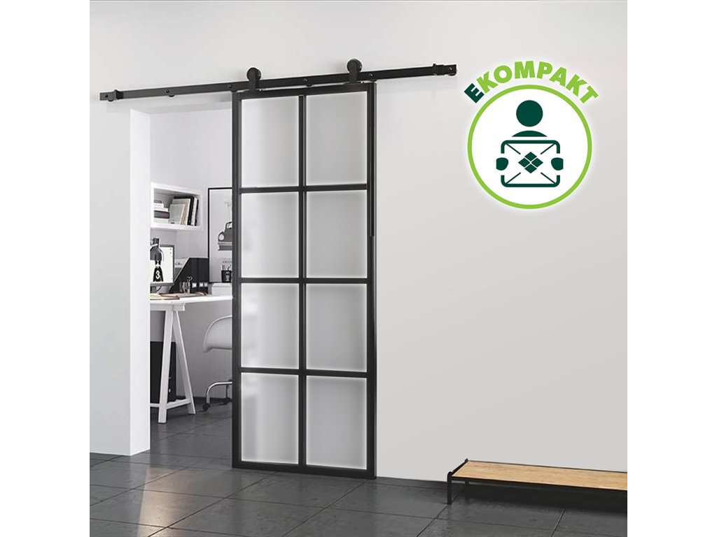 Zobrazené dekorácie nie sú súčasťou produktu. Intériérové hliníkové dvere s mliečnym sklom. Dvere: AL + RAL9005, tvrdené mliečne sklo 6mm Rozmery : 2150 x 980 x 28mm Kovanie: koľajnica 200 cm - 1ks, vozík - 2ks, doraz - 2ks, spodné vedenie - 1ks, madlo - 1ks. Dodávané v demontovanom stave.